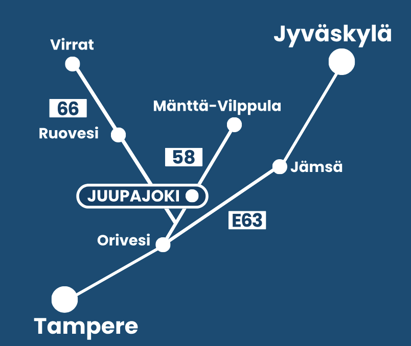 Juupajoki sijaitsee Ylä-Pirkanmaalla hyvien kulkuyhteyksien päässä. Perille pääsee myös junalla.